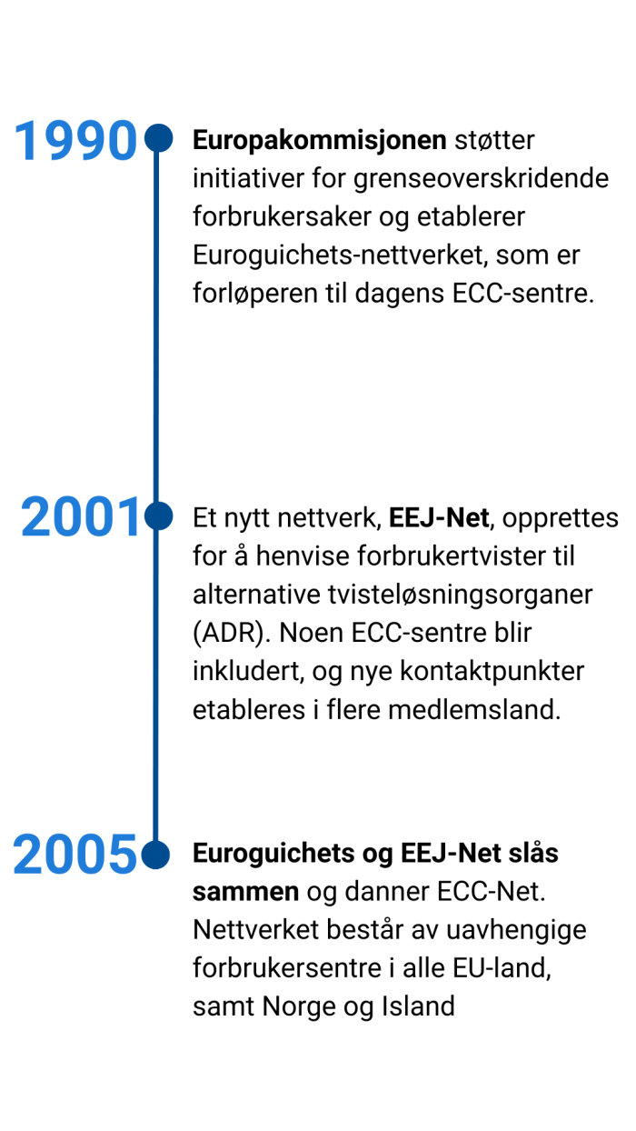 Historien vår begynner på 90-tallet da EU-kommisjonen ville gjøre det enklere for folk når de handlet eller reiste på tvers av landegrenser. De begynte å gi støtte til initiativer som skulle gi forbrukere informasjon og hjelp. Ett av disse initiativene var Euroguichets, et nettverk som etter hvert utviklet seg til å bli det vi i dag kjenner som de europeiske forbrukersentrene (ECC).